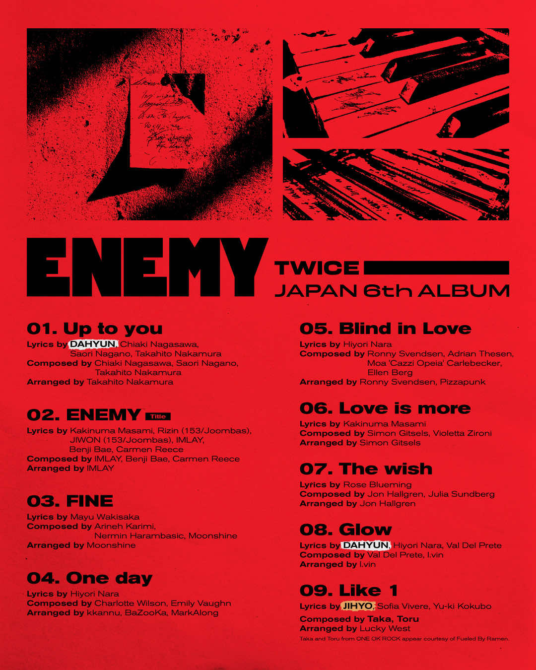 TWICE JAPAN 6th ALBUM『ENEMY』はメンバーのジヒョがディレクションを務めた作品。ビジュアルや、楽曲、ミュージックビデオに至るところまで、ジヒョがディレクションに参加している。