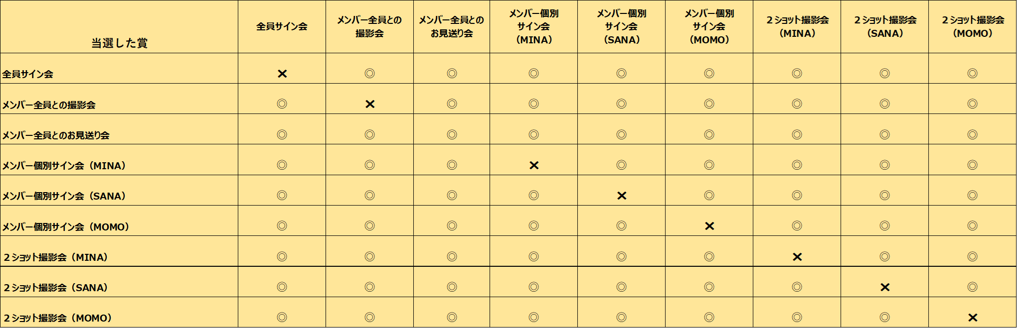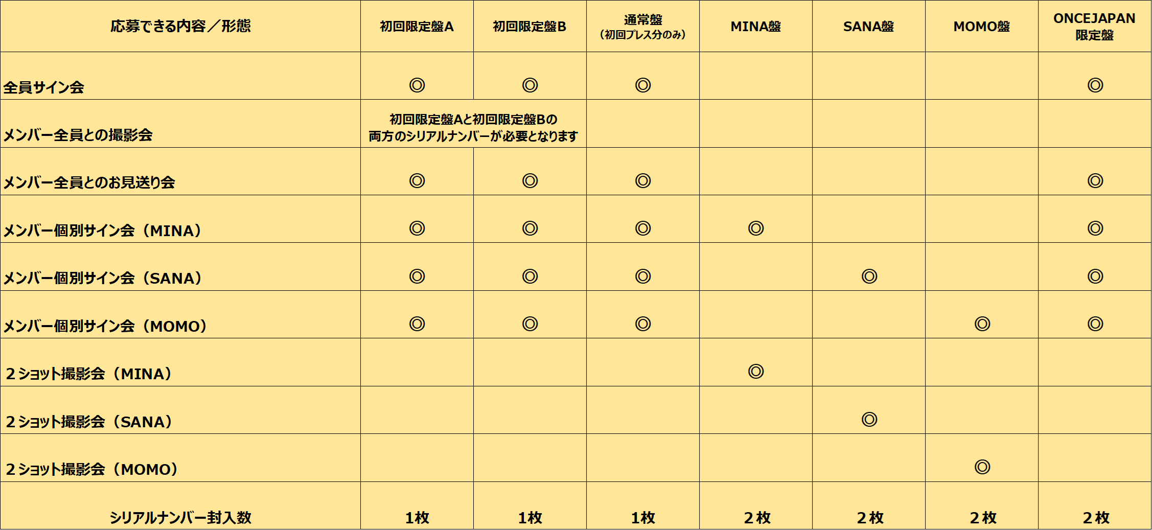 例)MINA盤をご購入されたかたはMINAとの2ショット撮影会もしくはMINAとの個別サイン会に応募が可能。他のメンバーの2ショット撮影会や個別サイン会には応募が出来ません。